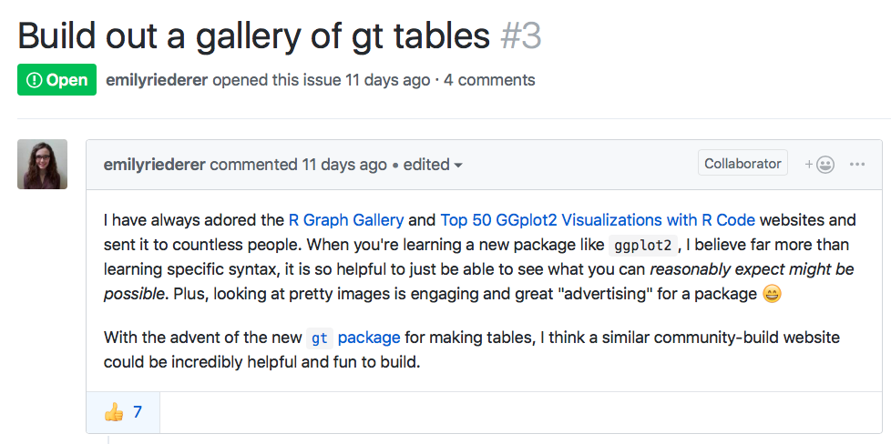 During the week previous to the R Unconference, all the attends have the chance of create their own issues and check the issues created for the rest of the attended, I checked that list in order to evaluate in which area I could contribute: Bingo! Emily suggested to create a gallery of examples of a gt package, and because I have some experience working with ggplot2 and plot.ly, I though that project could be a good small project for this weekend.